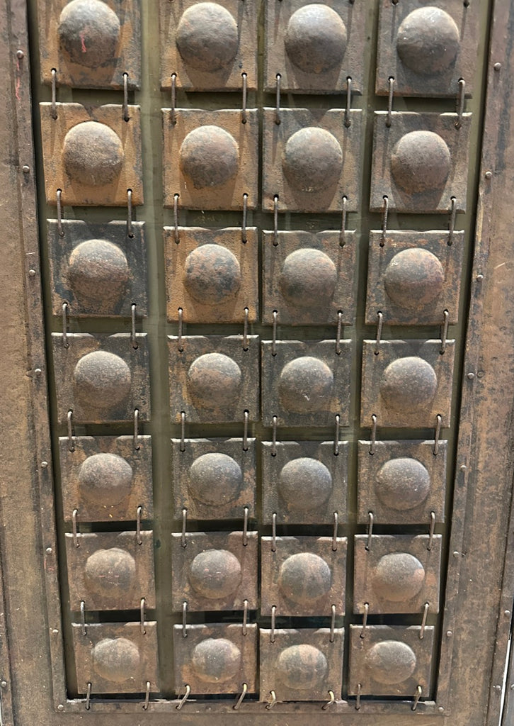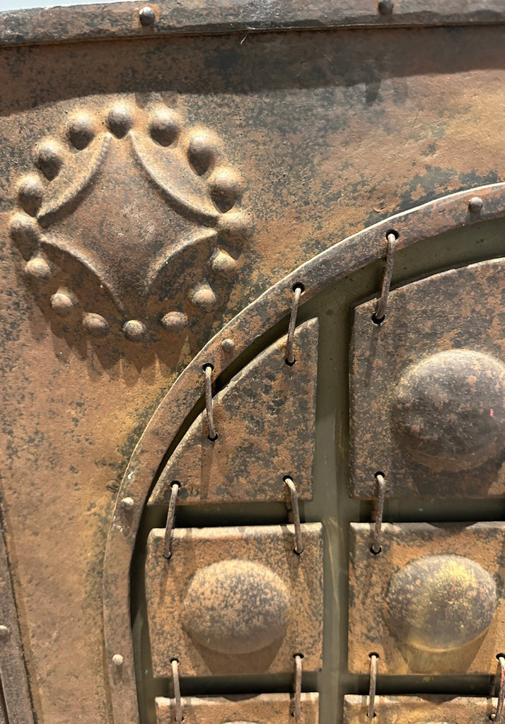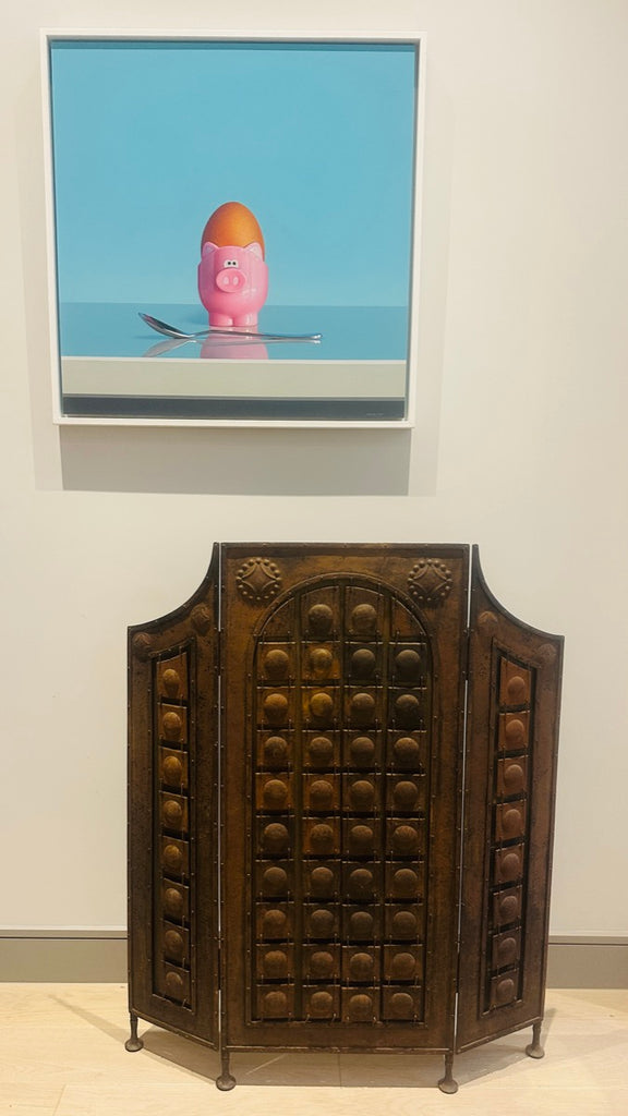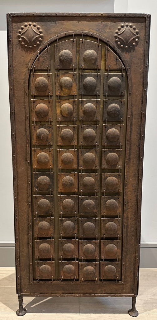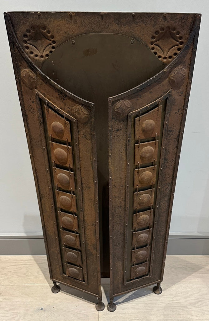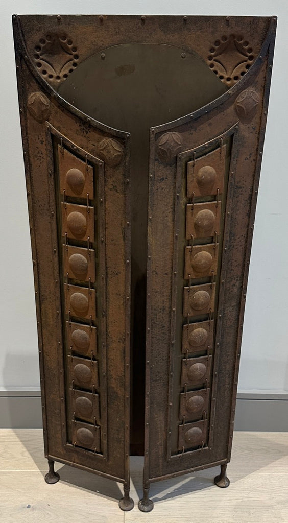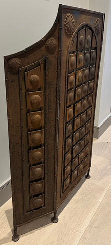 The screen features a large central panel with an arched cutout, from which a grid of metal sections with a convex circular metal spot in the centre are suspended each connected by a metal clip. The two stabilising side panels each contain a single grid of similar metal pieces with embossed circles. All three sections are connected with decorative hinges on the reverse and the screen stands on four conical feet. The flaps can fold into the main panel for easy transport. While serving a practical purpose, the piece also functions as a purely decorative object.