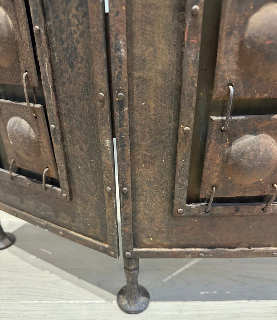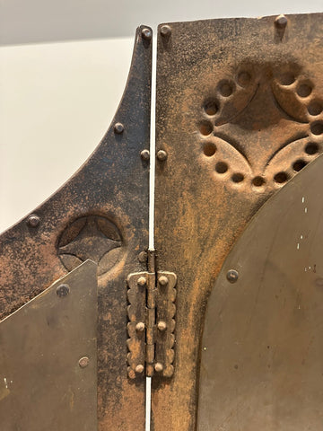 This intricately designed, three-panel iron screen from circa 1910 is a piece of German Arts and Crafts, or Jugendstil, metalwork. It is attributed to the notable German architect and designer Richard Riemerschmid (1868-1957), a key figure in the Jugendstil movement who was influenced by the British Arts and Crafts movement. Riemerschmid was known for creating functional, well-made designs and was a founder of the Deutsche Werkstätten für Kunst im Handwerk and the Deutscher Werkbund.
