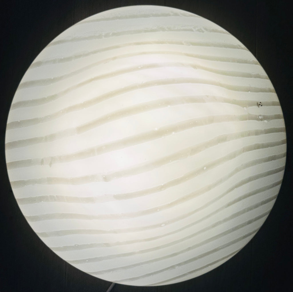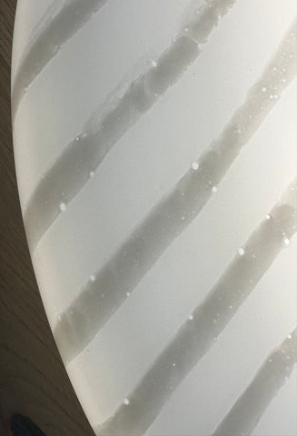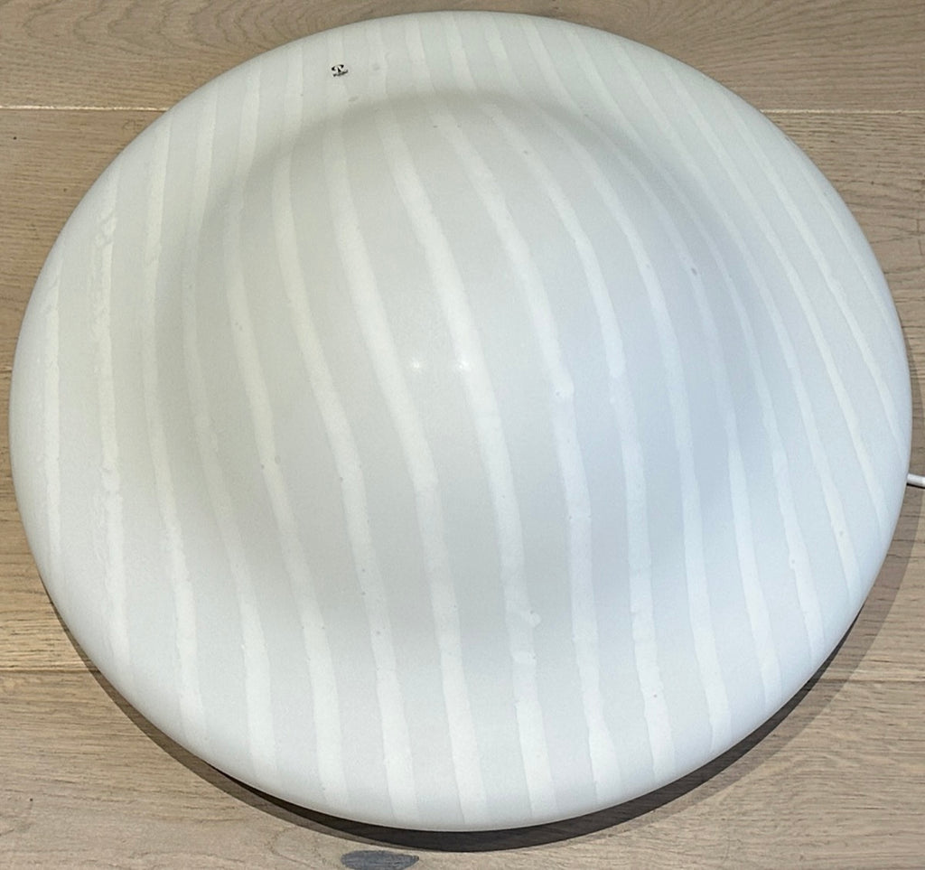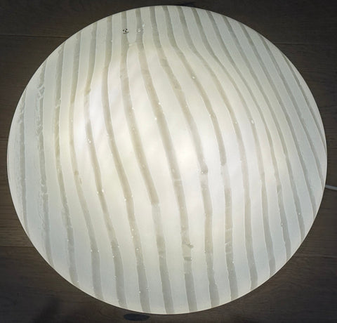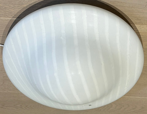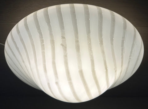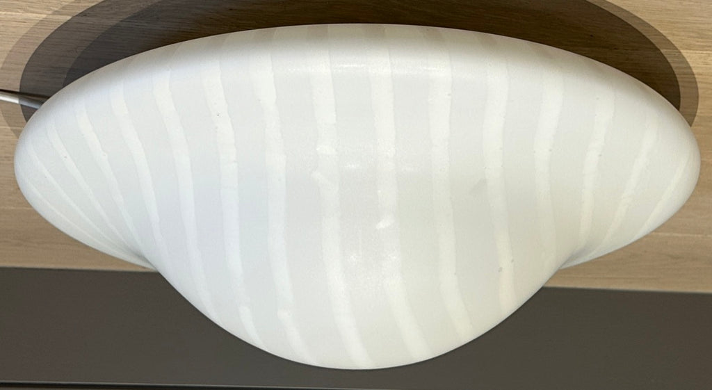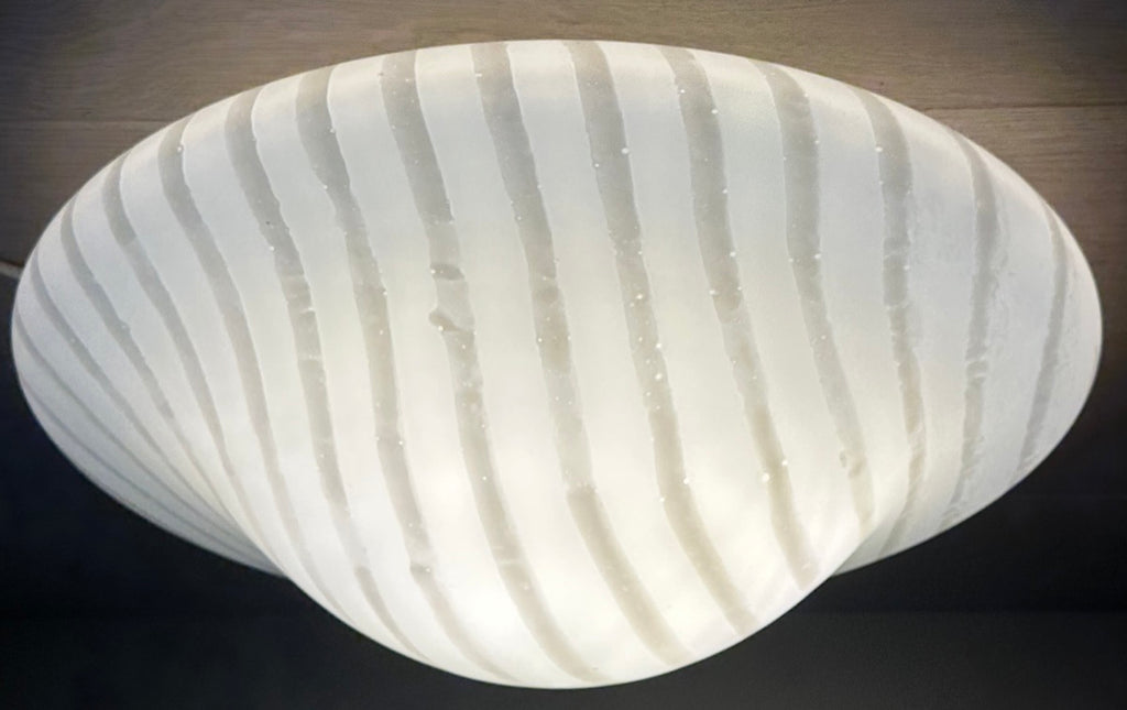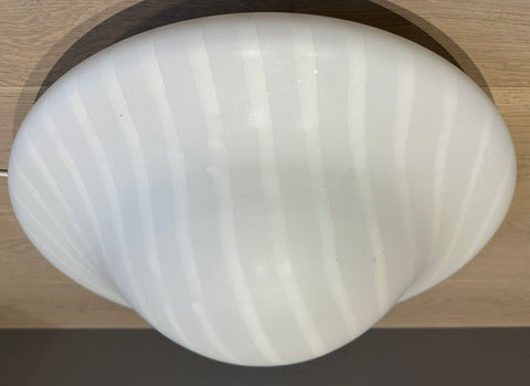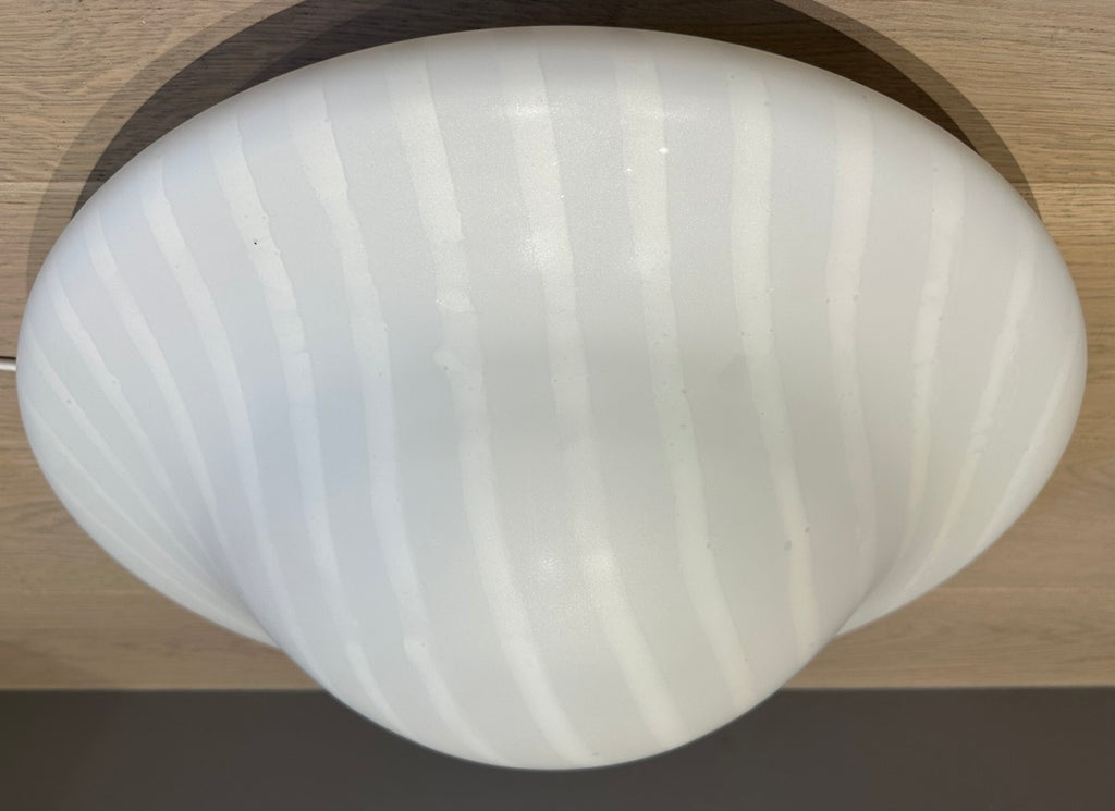The glass is curved and rounded at the edges and bulbous in the centre with the stripes running across the whole body of the shade. The flush mount is also relatively large, making it a good choice for a variety of spaces with a low ceiling. It would be a beautiful focal point in a living room, dining room, or bedroom to add a something a little different and striking especially if there is a low ceiling.