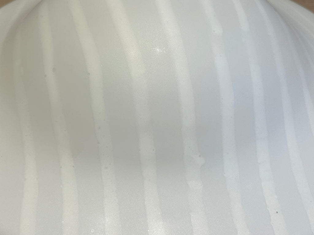 Large 1970s German Peill & Putzler plafoniere, space-age, opal glass with a lighter striped pattern flush mount ceiling light. The opal striped-glass circular shade is fixed onto the white lacquered metal frame/bulb holder with three interspersed metal clips which screw into the rim of the shade holding it in place.