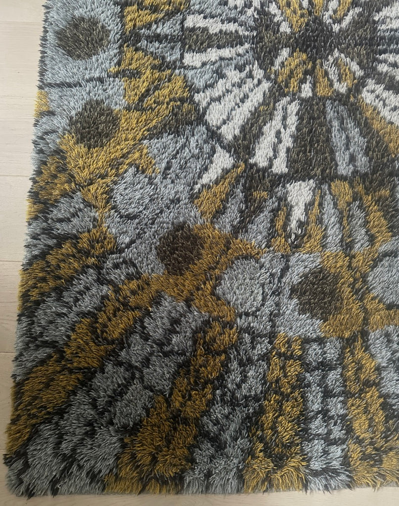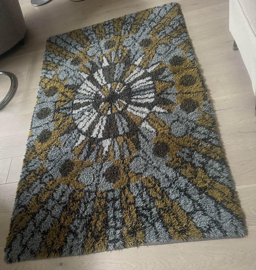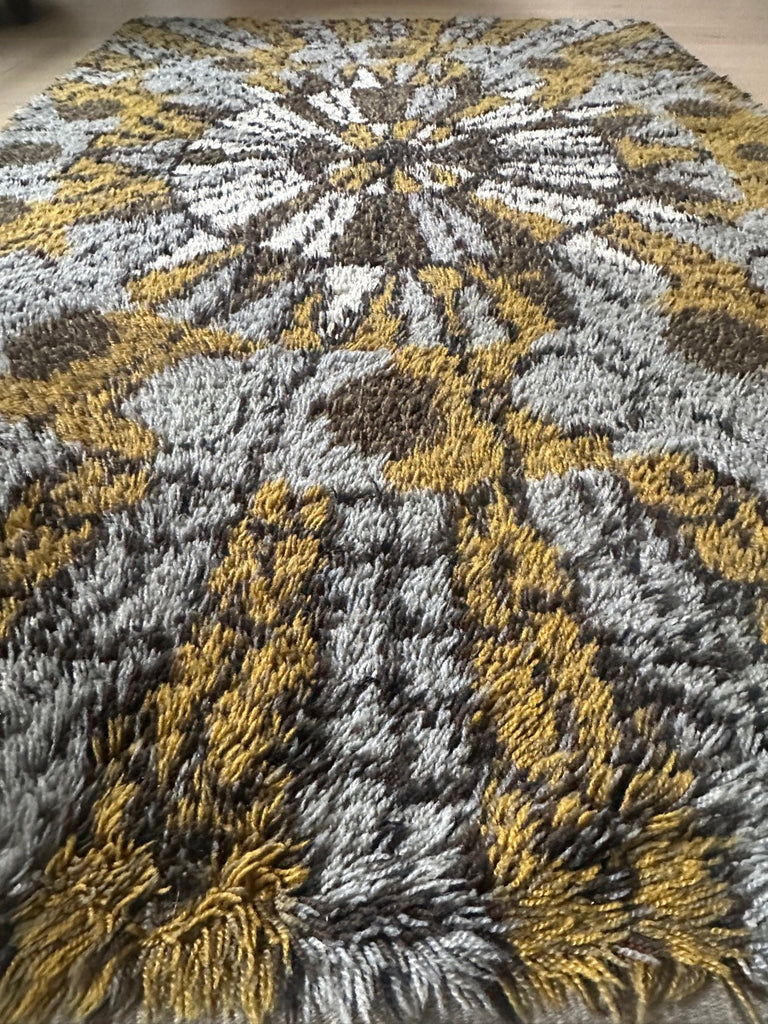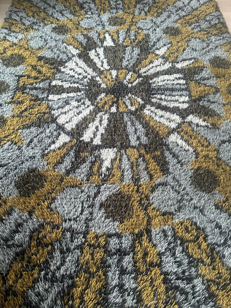 This is a vintage Scandinavian Rya rug from the 1960s, featuring a distinctive long, shaggy pile made from knotted wool. Rya rugs have a rich history, originally serving as thick bed covers for sailors in the 15th century before evolving into decorative pieces prized for their warmth and bold designs.