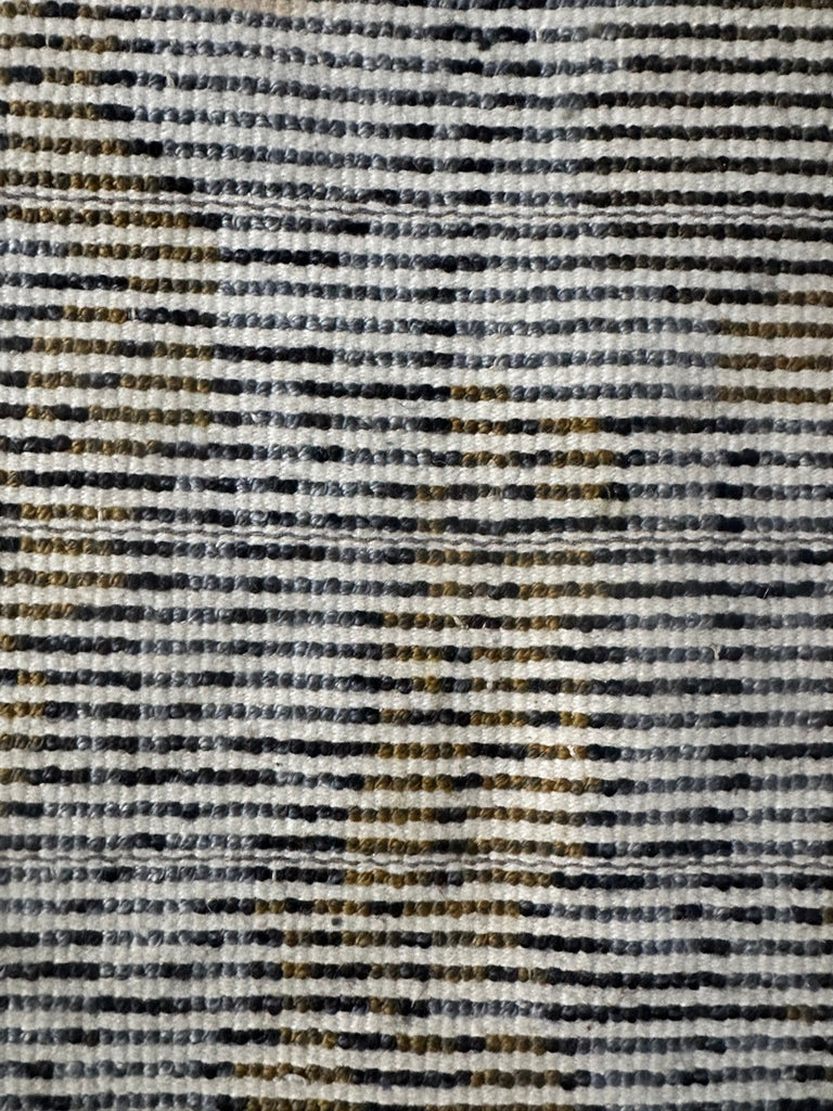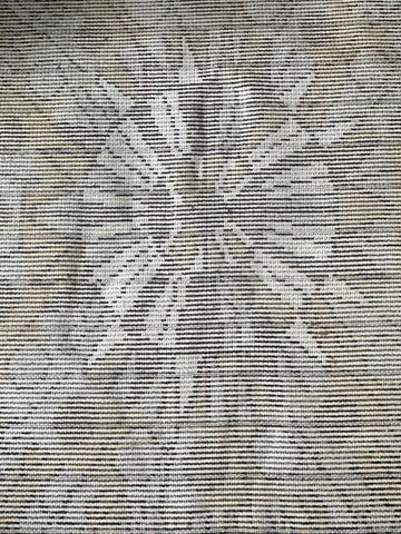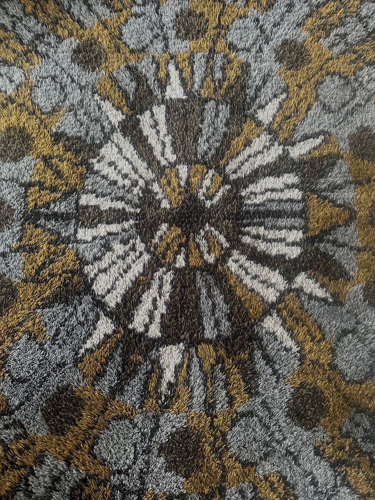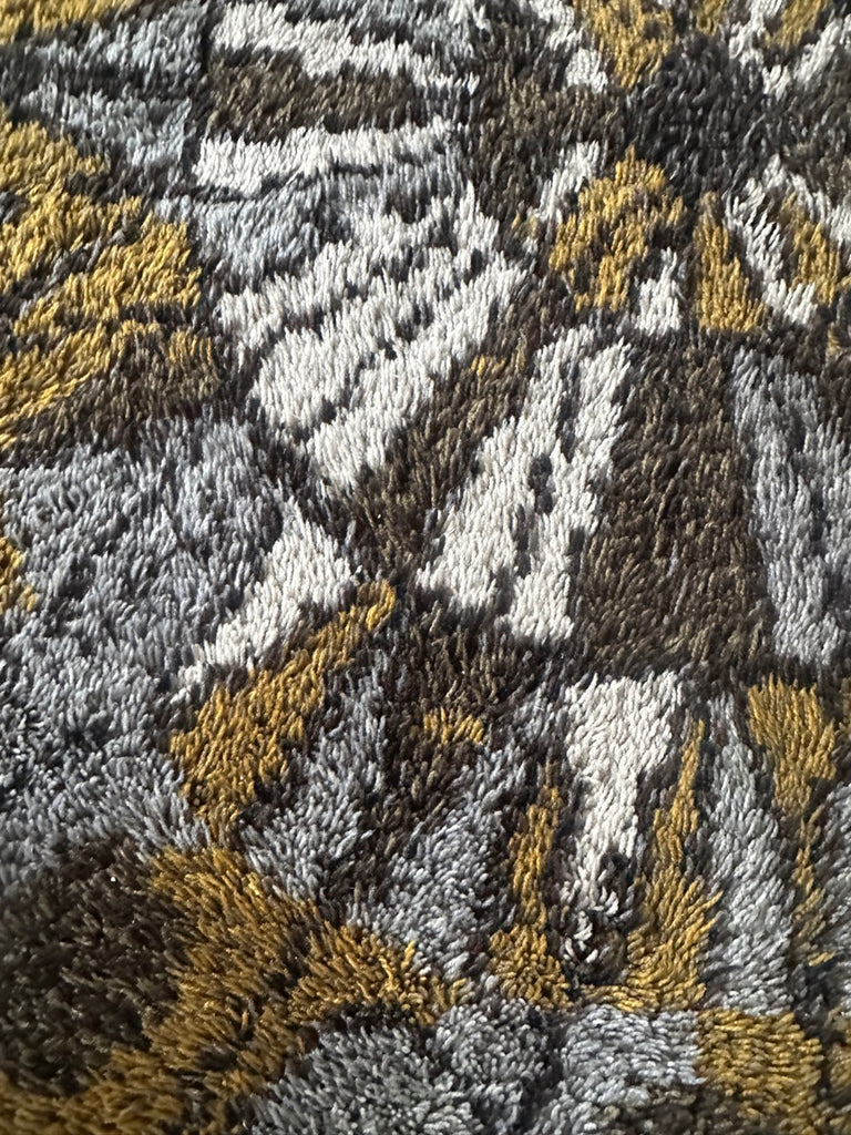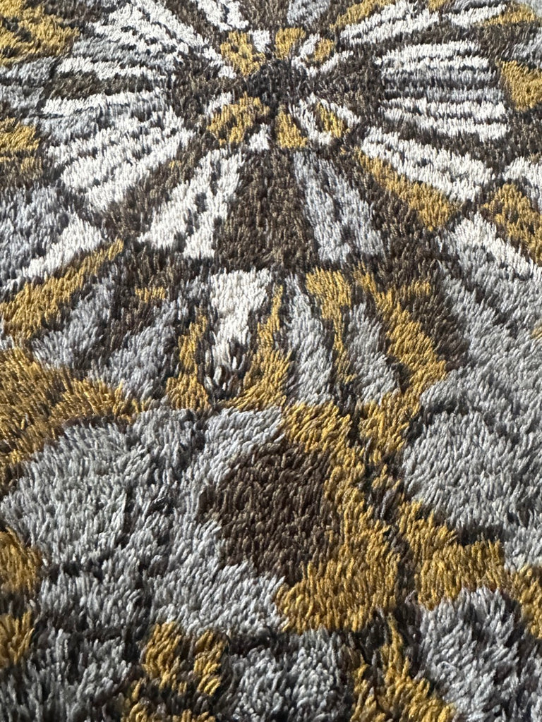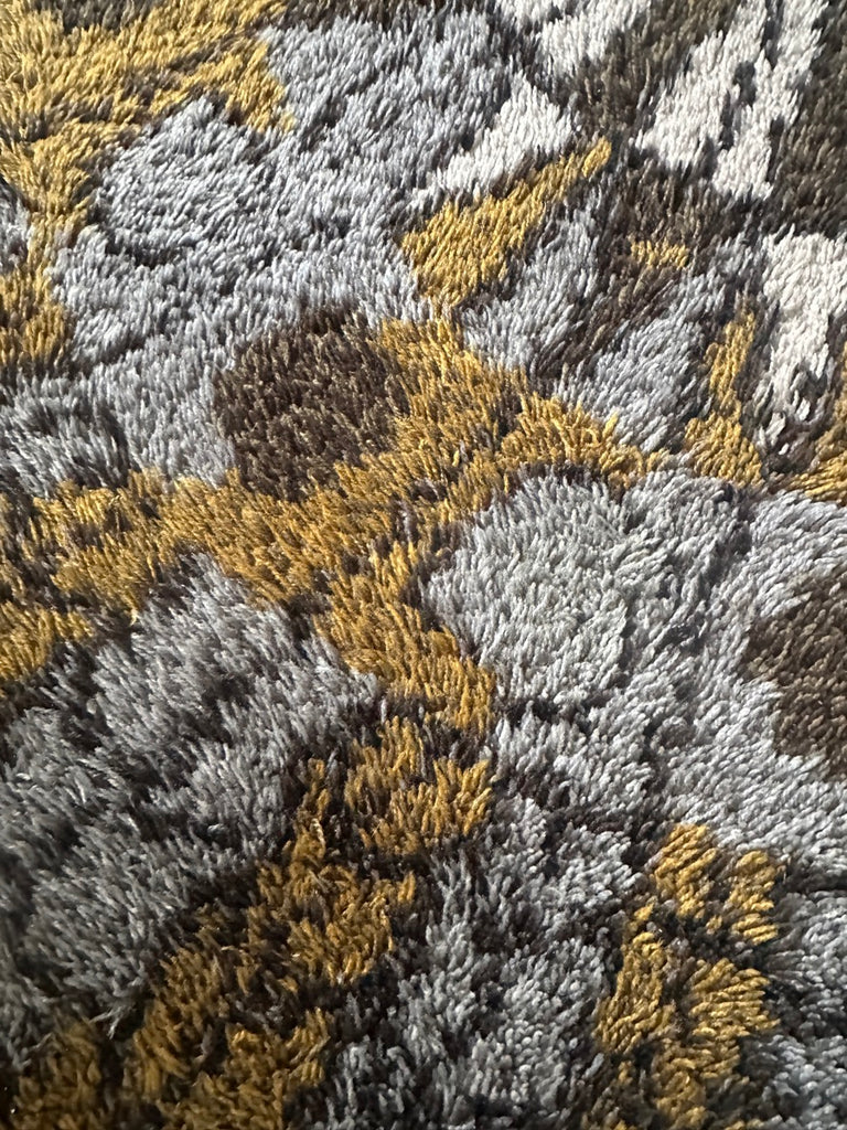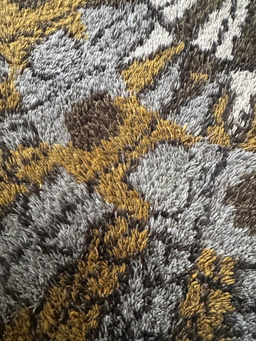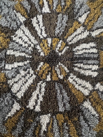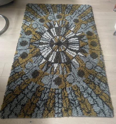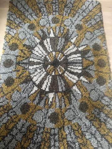 The rug's design is typical of the mid-century modern aesthetic, which often features bold geometric patterns and abstract shapes. The colour palette includes shades of grey, gold, brown, and white, which were commonly used in mid-century modern designs. The centre resembles a clock or sun dial The long, soft pile is known for creating a tactile surface that changes with the light and adds a luxurious feel to any space.