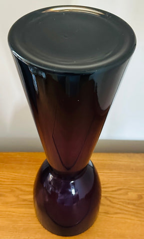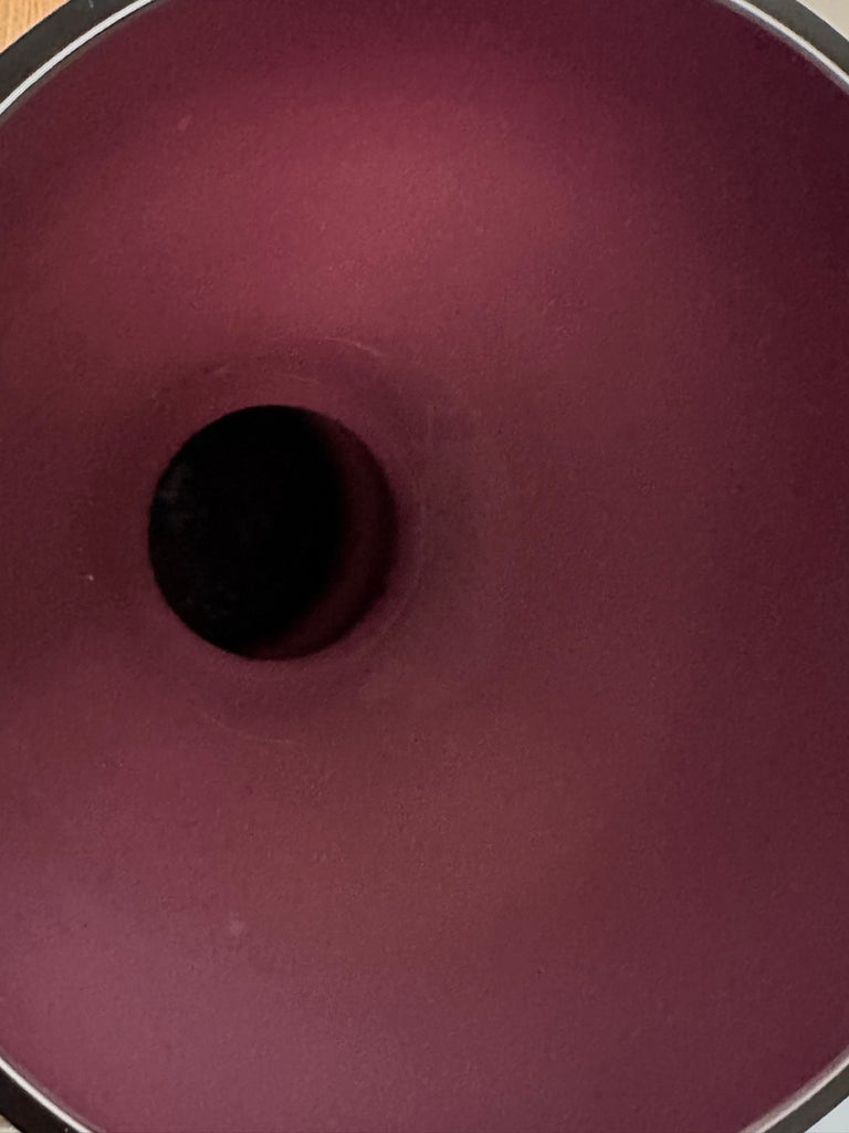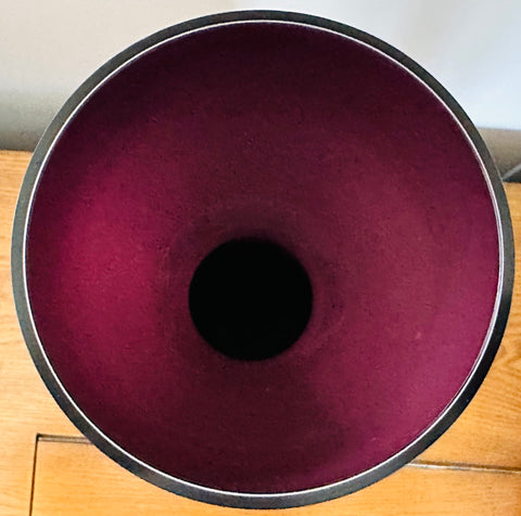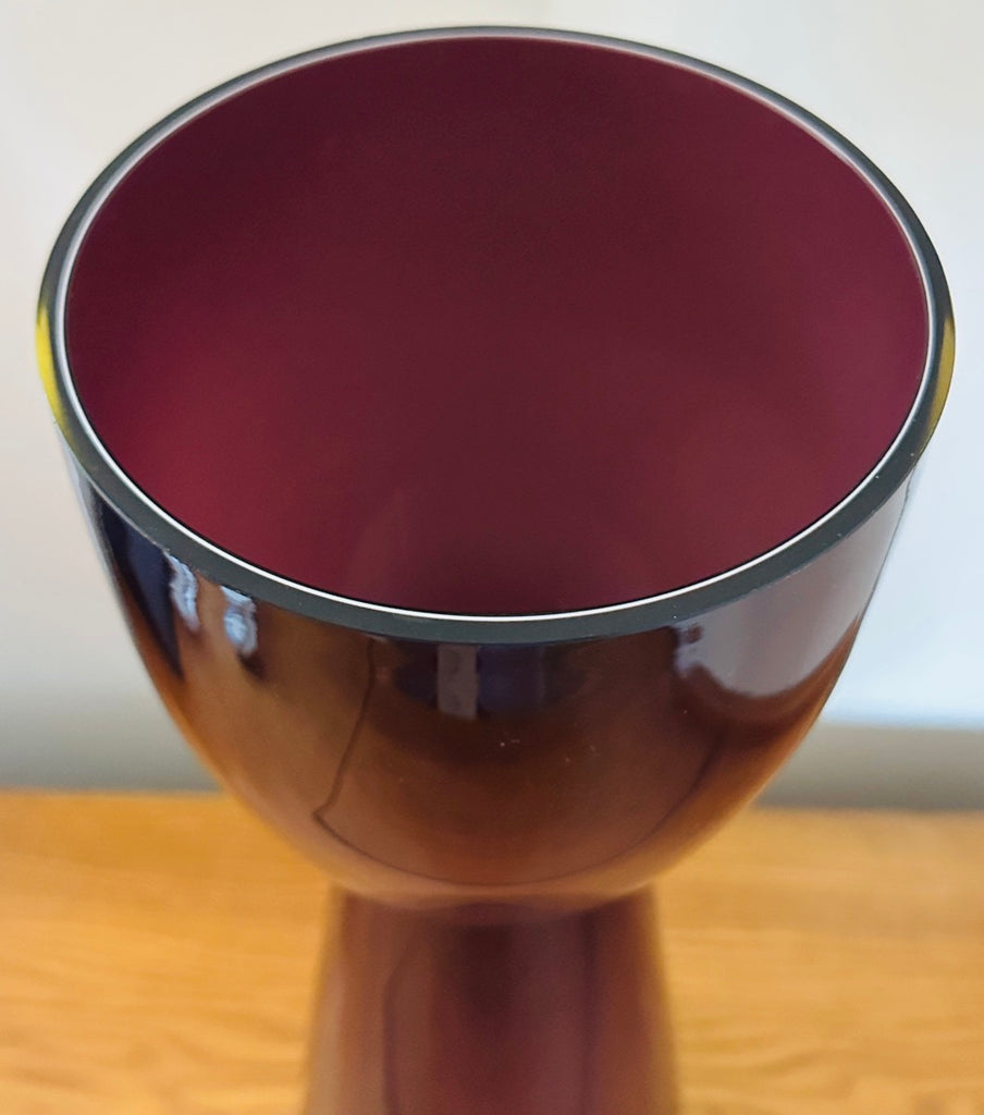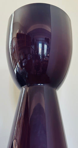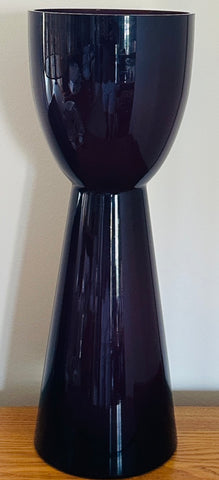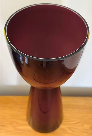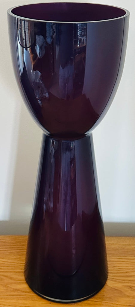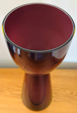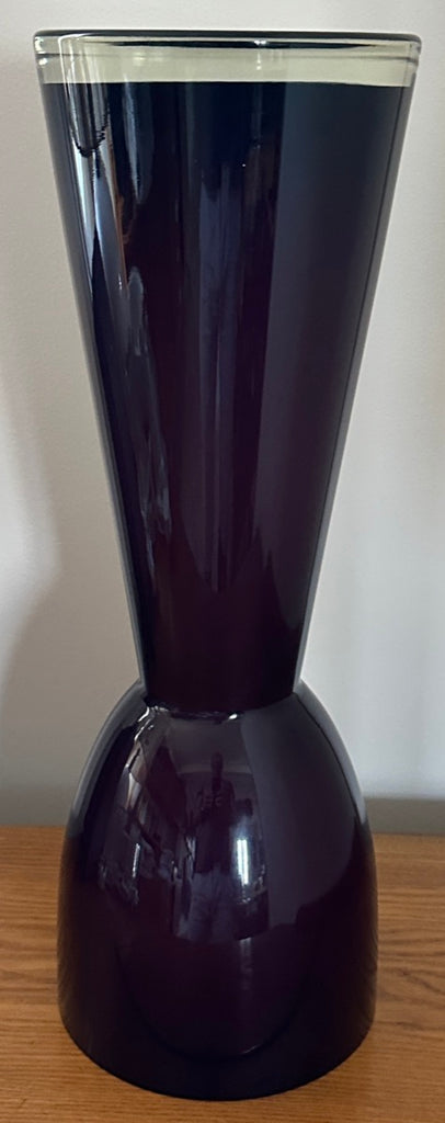 A striking example of 1960s Scandinavian modern design, this large encased glass vase embodies the bold simplicity and sculptural refinement that defined mid-century Scandinavian glassmaking during this period. Crafted in an aubergine purple colour encased in a thick layer of clear glass, the piece glows with remarkable depth and luminosity. A thin white layer is encased on the interior adding additional interest and luminosity. The colour appears almost black at first glance, but in natural light it reveals deep violet undertones that shift beautifully as the glass catches and reflects its surroundings. Attributed to Otto Bauer for Holmegaard.