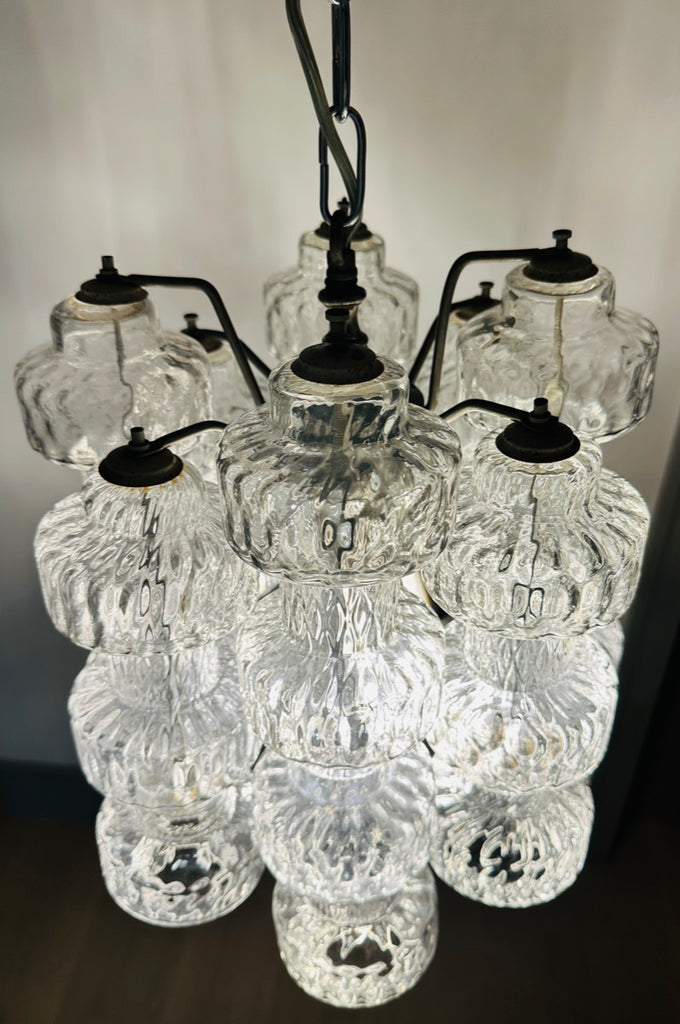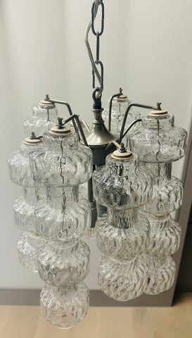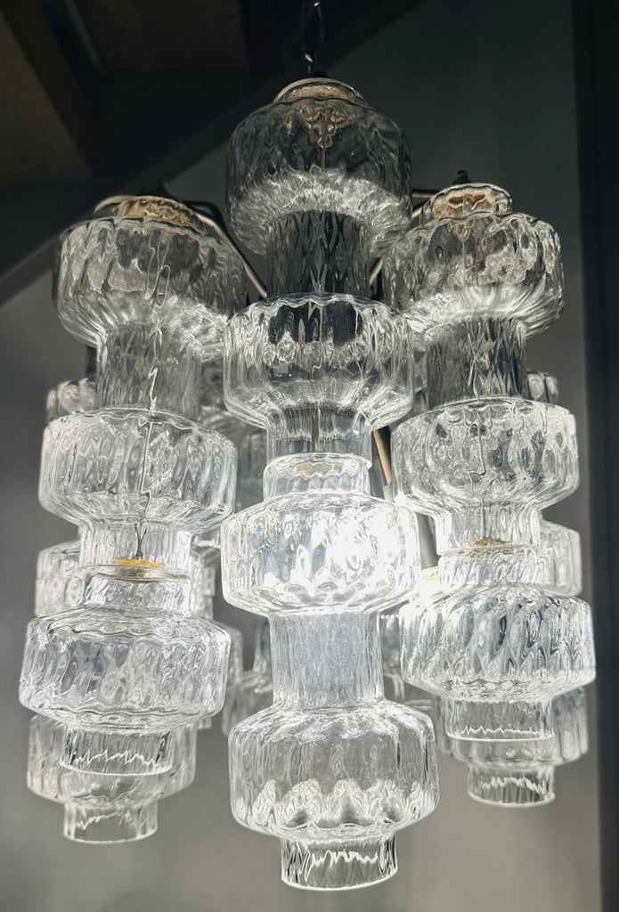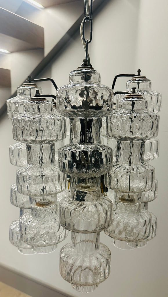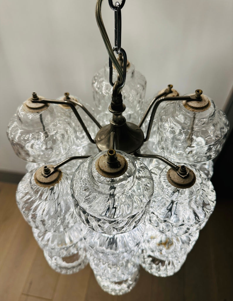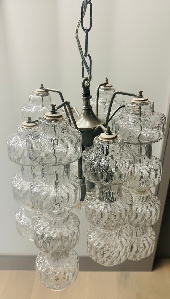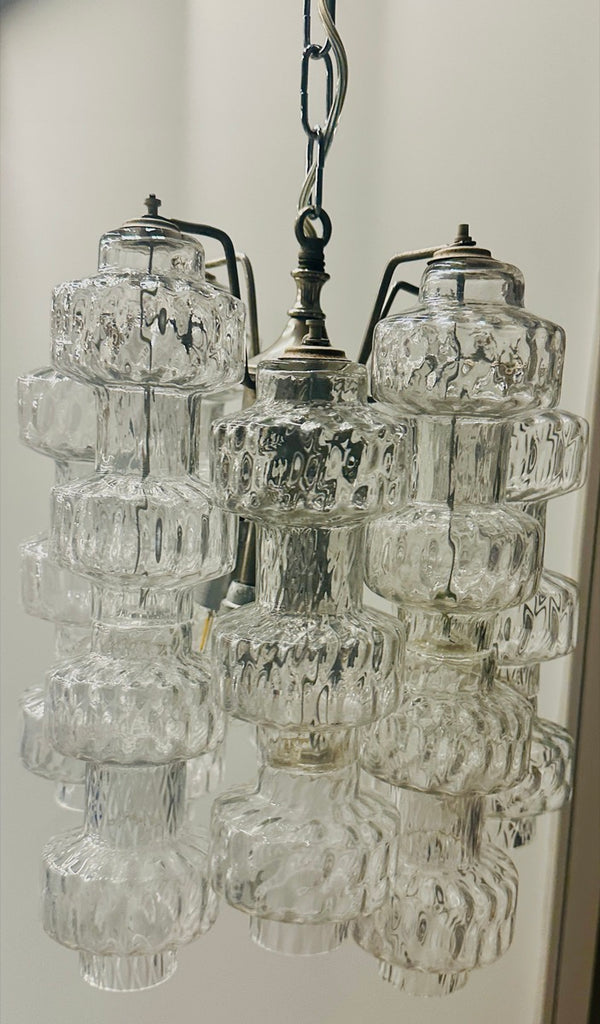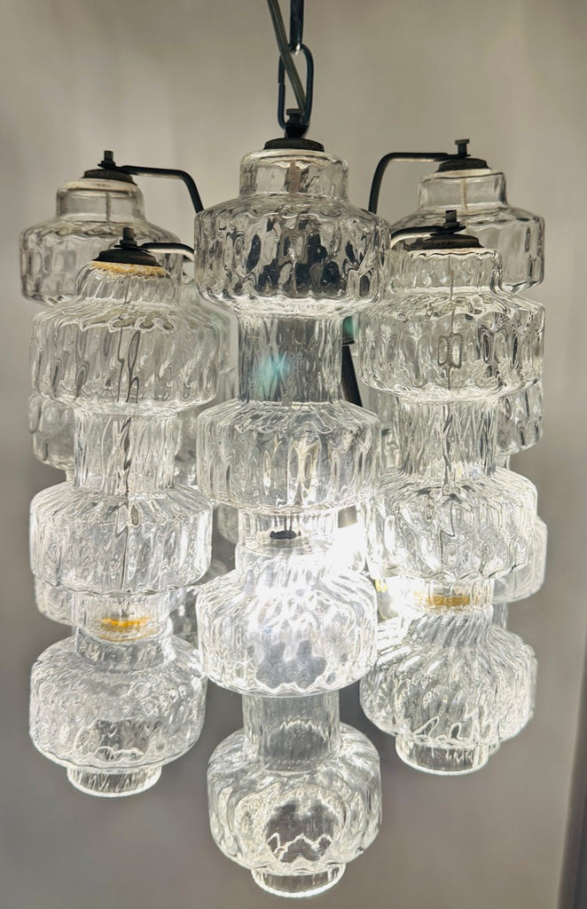 1960s Italian Murano clear textured iced glass chandelier by Venini. This stunning vintage chandelier is a remarkable example of Mid-Century Modern Italian lighting design, attributed to the esteemed glassmaker Venini. Handcrafted on the famous island of Murano, Italy, circa 1960s, it showcases the pinnacle of artisan glassblowing techniques. The fixture features eight clear, textured Murano glass elements suspended from a minimal frame of brushed nickel. The lightbulbs sit within the eight tubes.