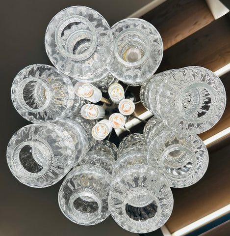 The surface of the glass catches and multiplies the light, creating a dazzling and luxurious effect that serves as a captivating focal point in any room. This piece embodies timeless elegance and a sophisticated design aesthetic.