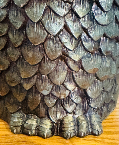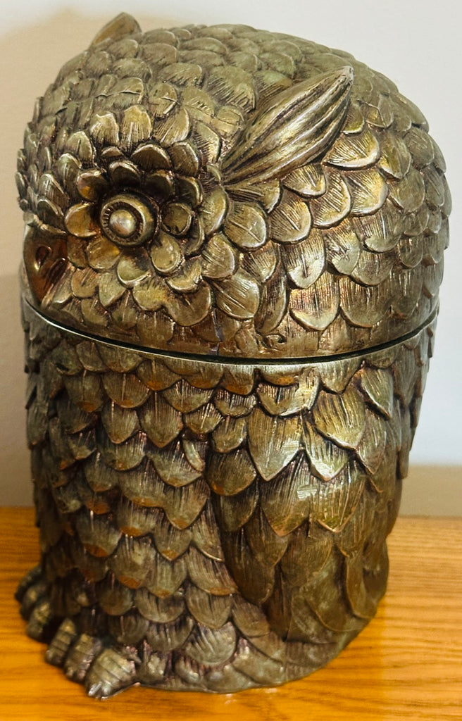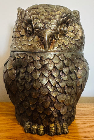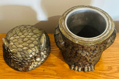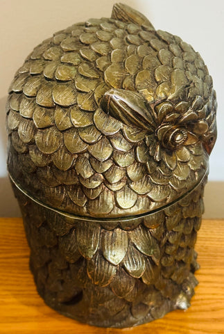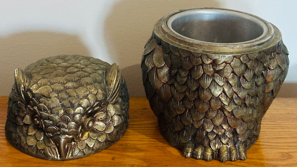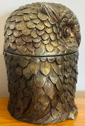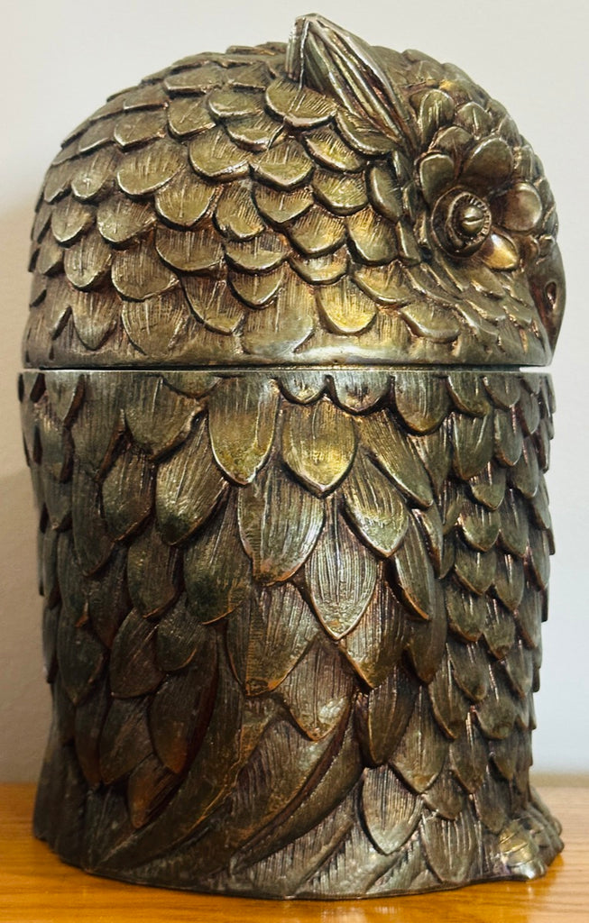 The owl is thoughtfully designed as a two-piece form, with the head lifting off to reveal the interior. The original removable aluminium liner is still present and can be easily taken out for cleaning after use. Both decorative and practical, this piece functions beautifully as an ice bucket while also serving as a distinctive sculptural accent for a bar cart, cocktail cabinet, or display shelf.