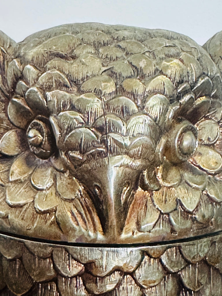 The bucket shows age-related discoloration consistent with vintage silver-plated aluminium, adding to its authentic character and patina. The lid is not hinged and lifts off smoothly as intended. With its remarkable detail, quality construction, and unmistakable mid-century charm, this Mauro Manetti owl ice bucket would make a sophisticated and conversation-starting addition to any home bar or collection of Italian design.