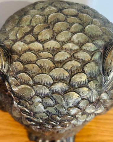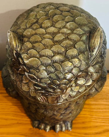 This striking 1960s Italian owl ice bucket was designed by renowned Florentine designer Mauro Manetti and produced in Firenze, Italy for Fonderia D’Arte Foundry. A celebrated example of mid-century Italian glamour, the piece is crafted from silver-plated cast aluminium with a warm gold-toned patina that beautifully highlights the intricate feather detailing and expressive facial features. The sculptural quality and rich surface finish give the owl a bold yet elegant presence, making it equally suited for display or functional use.