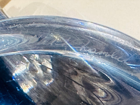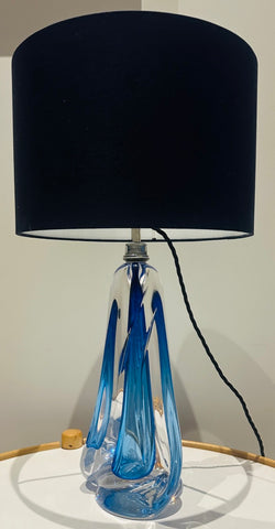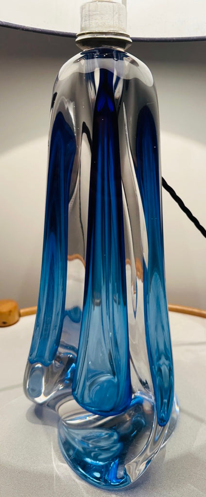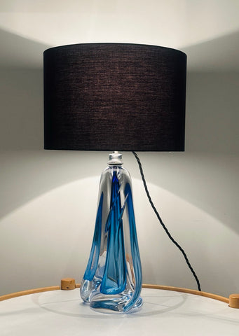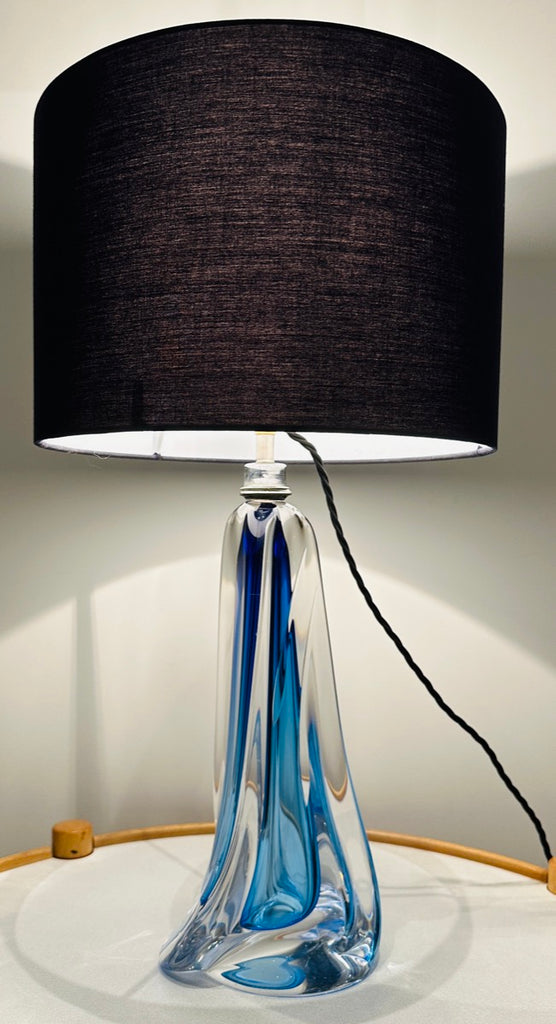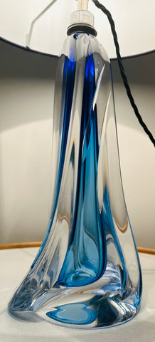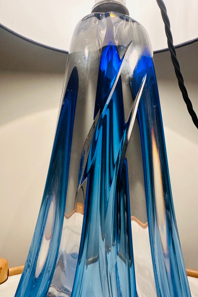 Crafted in rich blue and clear heavy lead crystal, this lamp features a tapering geometric form with a fluid, almost architectural presence. The glass has wonderful depth and luminosity, catching the light from every angle. Handmade in Belgium using traditional techniques, each example shows subtle variations in the crystal, making every lamp slightly different despite sharing the same design. This lamp base is also different from others I have sold and I am selling because it has two parallel feature incisions on one side. It is finished with a polished chrome light fitting and a black silk flex.