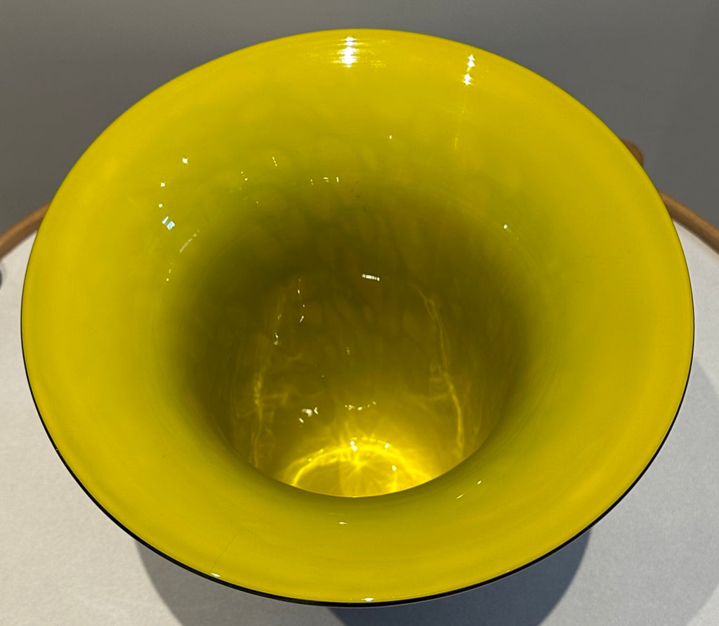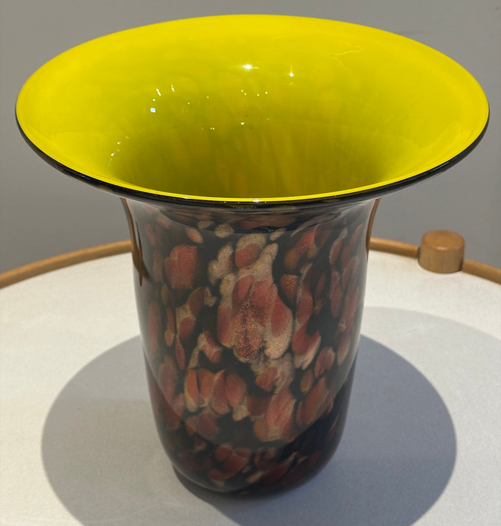 A striking handblown trumpet-shaped vase handblown in the United States during the 1990s. The vase features a black, brown and gold aventurine glass exterior. Aventurine glass is known for its metallic sparkling effect, often described as having copper dust or gold flecks swirled throughout the glass. The interior of the vase is a contrasting, bright yellow.