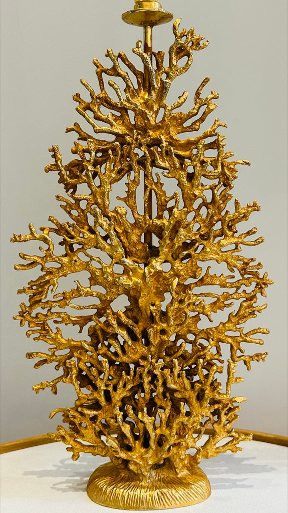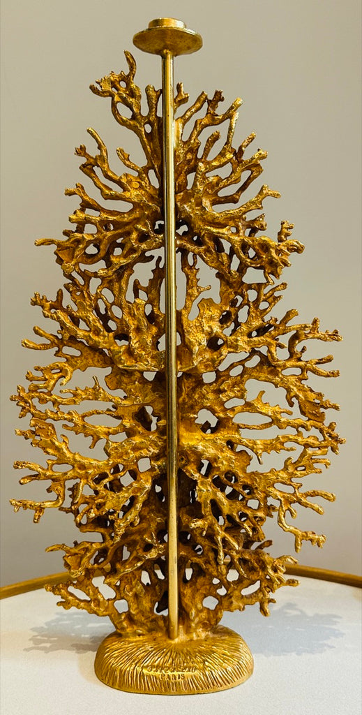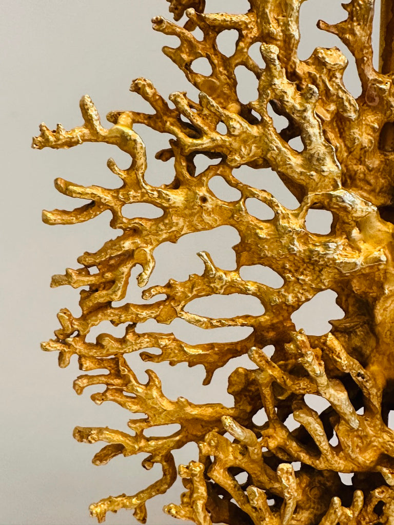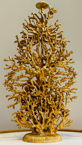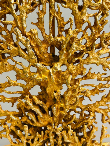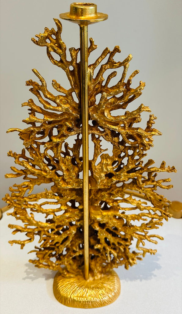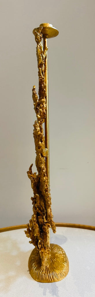 1990s French coral gilded "Morea" candleholder designed by Stéphane Galerneau. The candleholder is from the Création Galant collection, produced around 1995. The candleholder is created from a number of pewter coral branches welded together before being gilded and patinated to give depth and brightness to the relief. The coral is attached to a thin rod on the reverse with a single candleholder at the top.