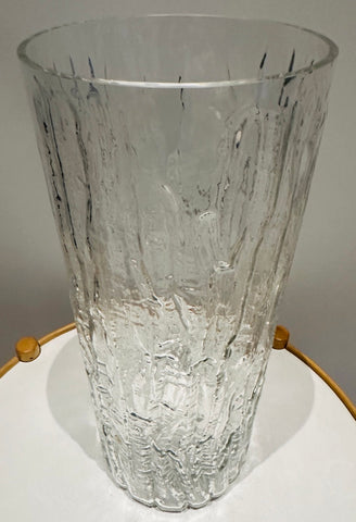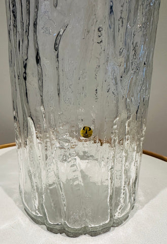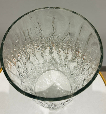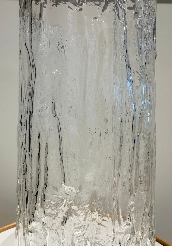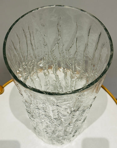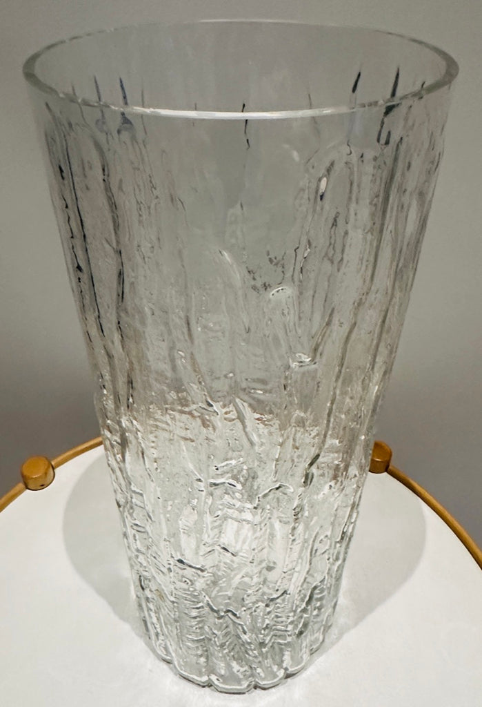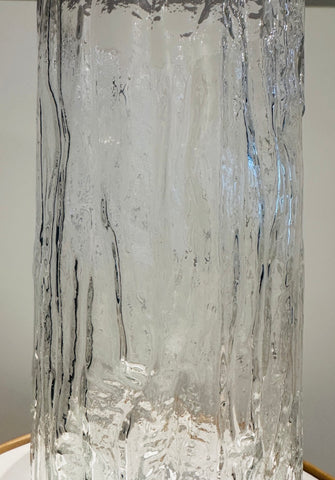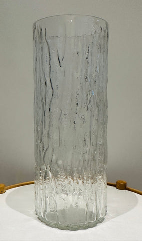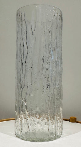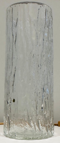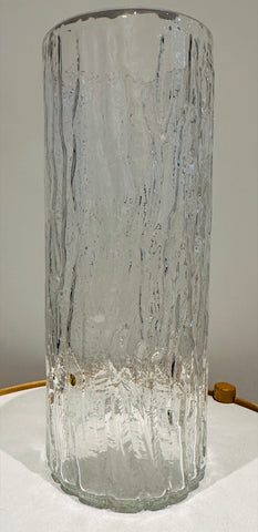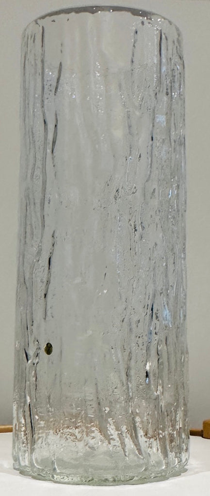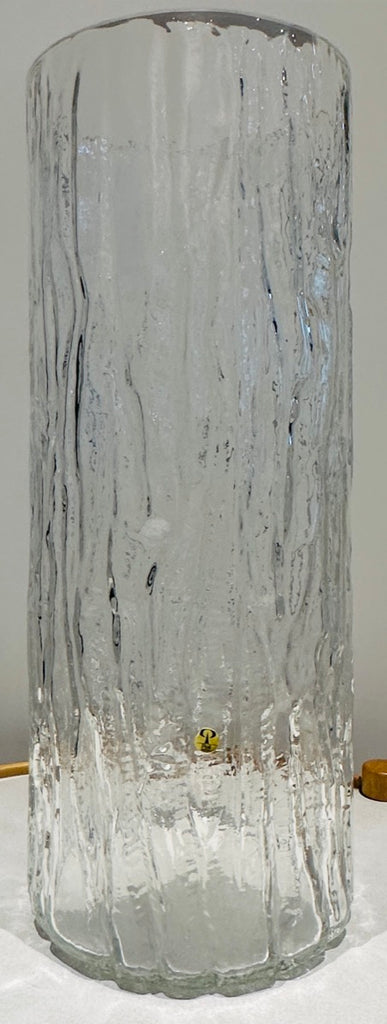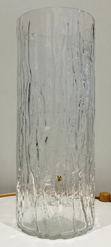 A beautiful and functional heavy thick clear glass 1970s German Peill & Putzler "ice glass" or "bark glass" cylindrical vase, very much in line with the Mid Century Modern aesthetic. The manufacturer's circular label is present.