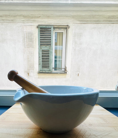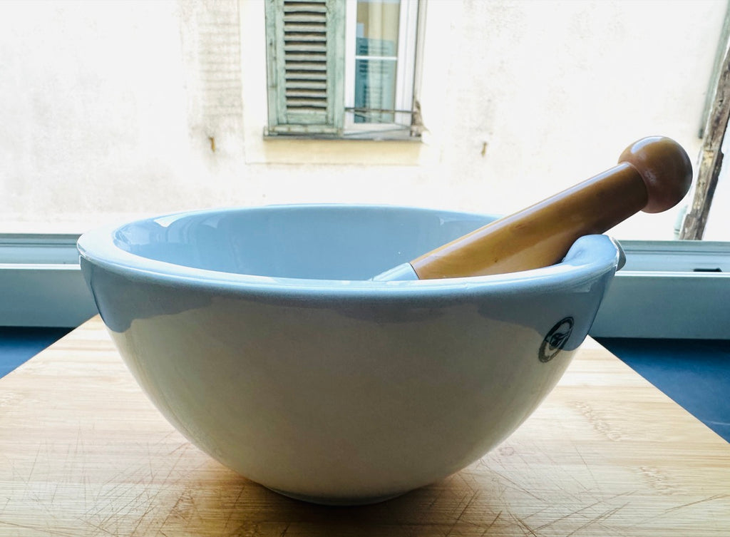 In very good vintage condition, with a bright glaze and no visible cracks or major chips. There is very little wear which is surprising considering its age and use. I guess this one hasn't had a great deal of use in the past. Whether you are seeking a reliable kitchen tool, an authentic piece of French pharmaceutical history, or a timeless decorative accent, this G.D.V. Bruère mortar and pestle offers both heritage and practicality in one refined object.
