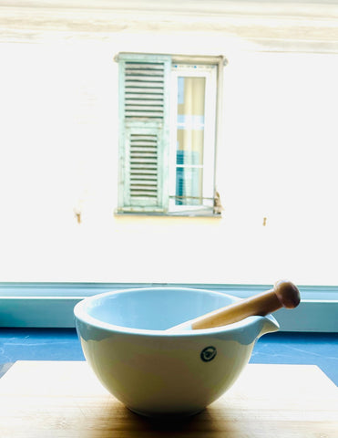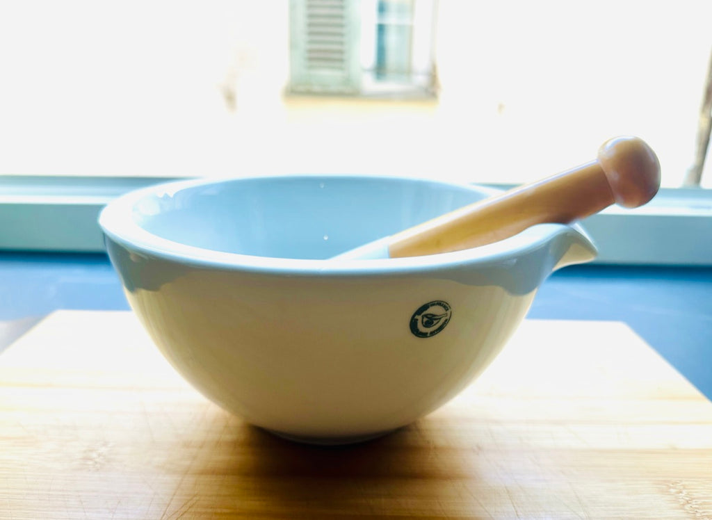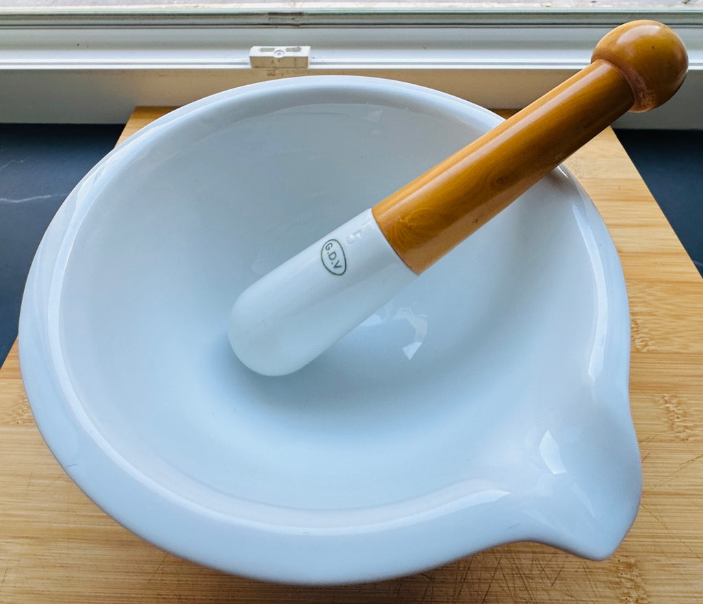 Pieces bearing the G.D.V. stamp from Bruère are valued for their craftsmanship and enduring quality. The weight and balance reflect traditional production methods designed for daily use in pharmacies and laboratories, yet its clean white finish and classic form make it equally appealing for culinary tasks such as grinding spices, herbs, seeds, and garlic.